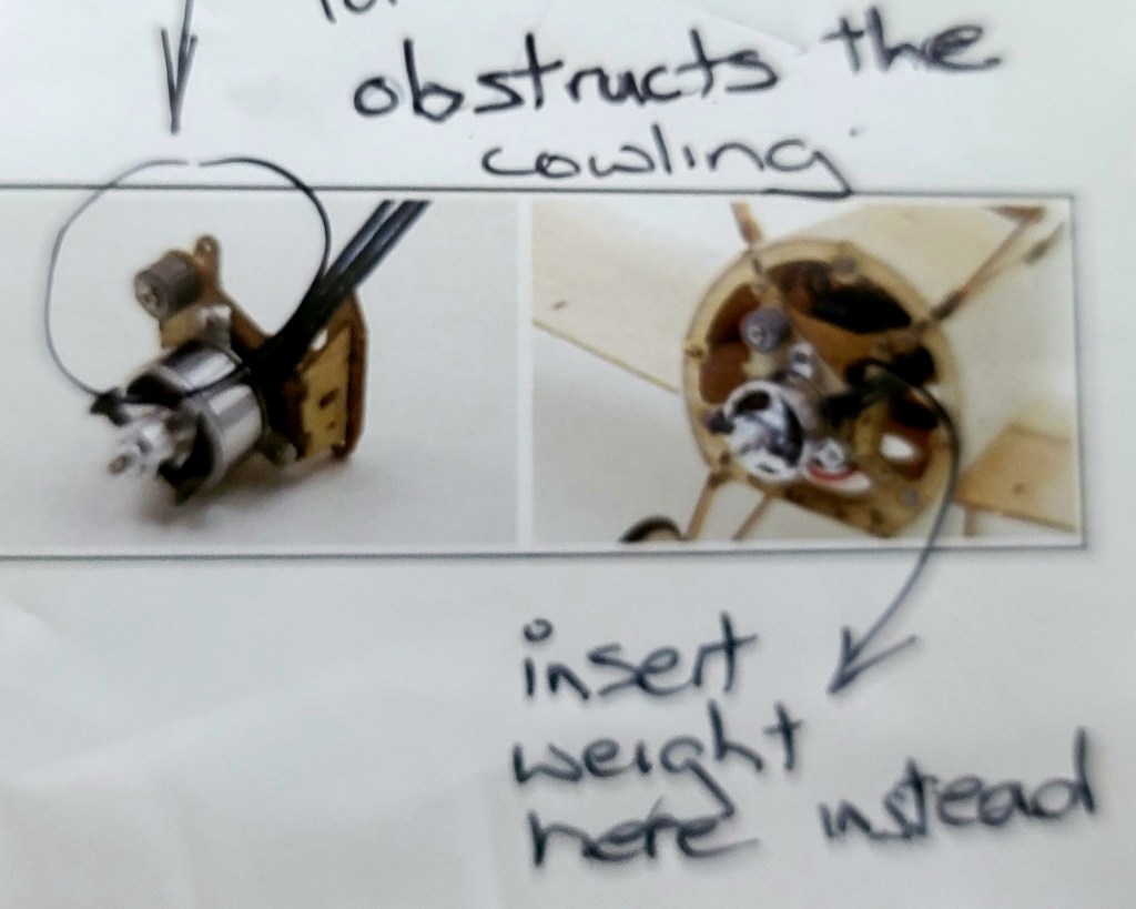 If you put the lead weight at the top of the special mounting base shown in “8. Assemble the Brushless Motor”, you will not be able to put the cowling on. Following the build instructions for “brushless motor”, the weight wrapped around the screw gets in the way, preventing the cowling from being clicked onto it’s magnet.
