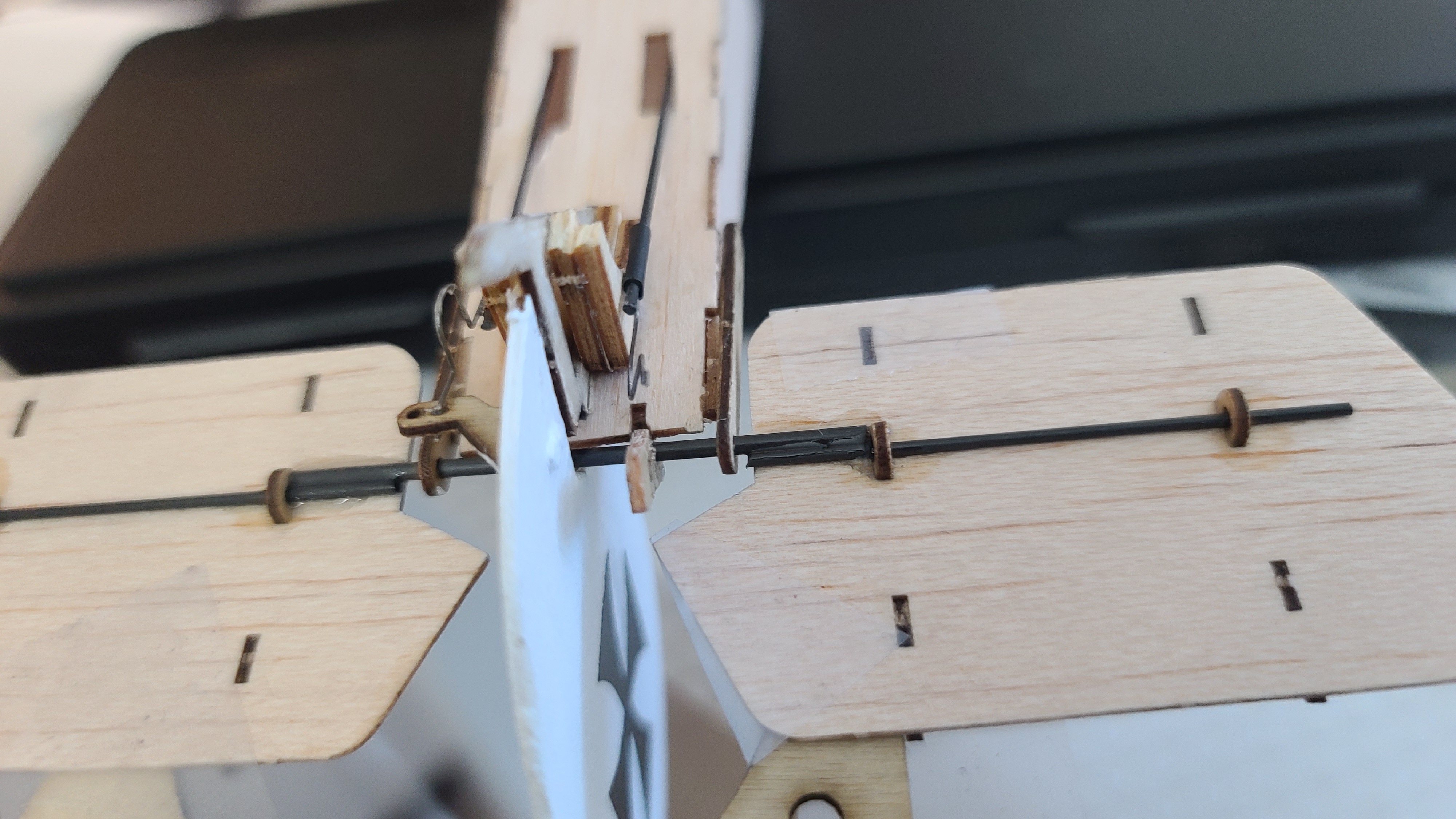 The picture from the Instructions is not very clear.I glued the small wire pieces to the wooden “6” pieces on the end of the control rods.Don’t do this. If you do this, the rods might rub or stick against the fuselage.Do this instead – not a huge difference, but might affect how the plane flies