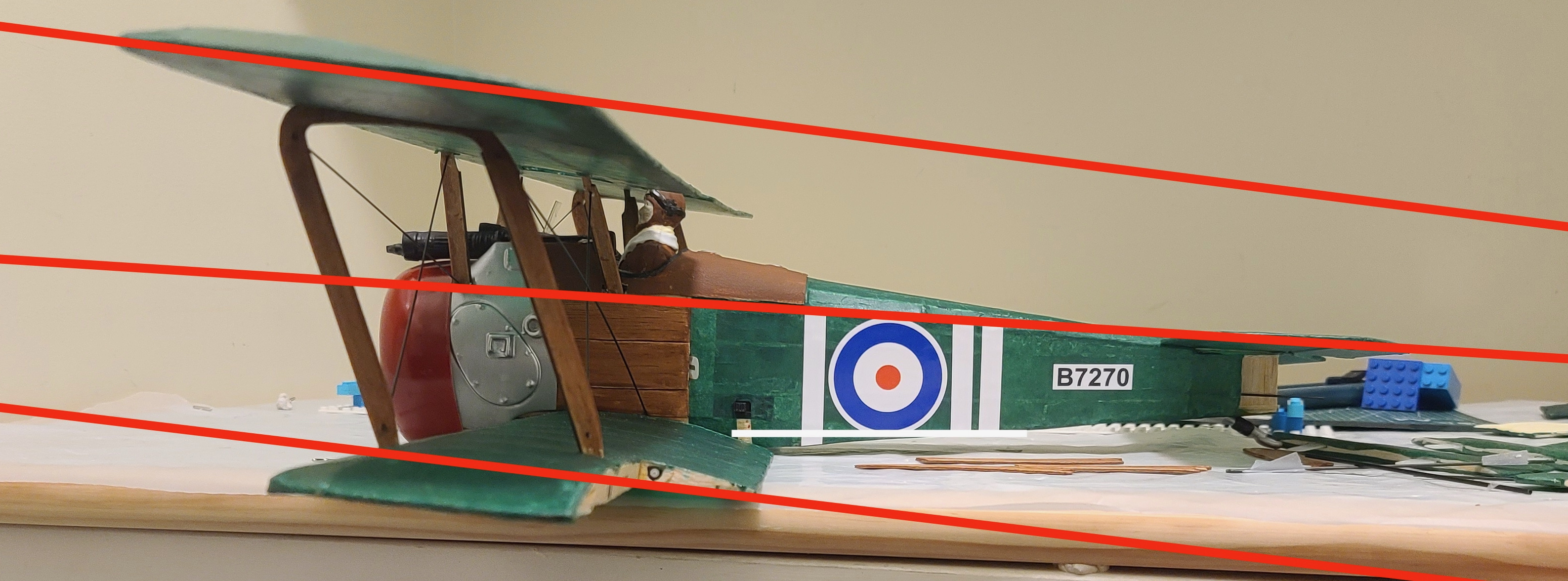 The plane tends to fly up and to the left. There is no down thrust or right thrust on the motor mount in this model, whereas the Sopwith Pup motor mount has a definite down/right angle to the mount. I added some packing on the motor mount to try to point the motor down and to the right.